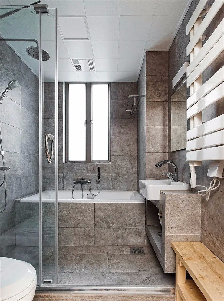 干濕分離的衛(wèi)生間設(shè)計(jì),干區(qū)的浴室柜完全騰空,碗形臺(tái)盆小巧可愛(ài),衛(wèi)生間移門(mén)貼上幾何畫(huà)貼就像是一面黑板墻。