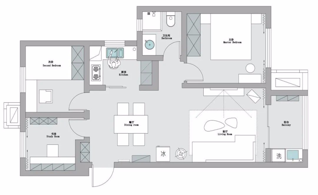 客廳與觀景陽(yáng)臺(tái)、餐廳連成一線,南北通透大空間盡情揮灑快樂(lè)。