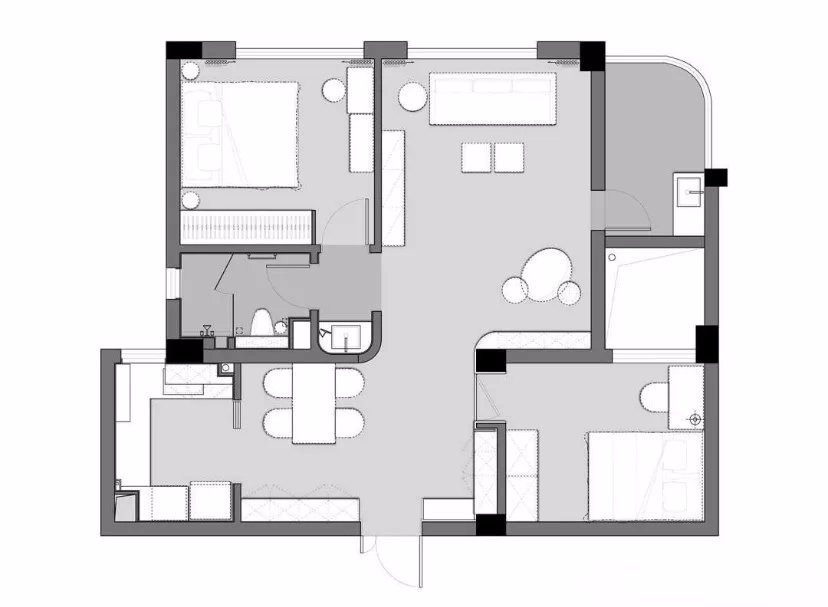 餐廳與客廳間的通道,墻角設(shè)計(jì)成圓弧形,柔化動(dòng)線,增加采光,?客廳柜體順勢(shì)做成圓弧形,相互呼應(yīng)。