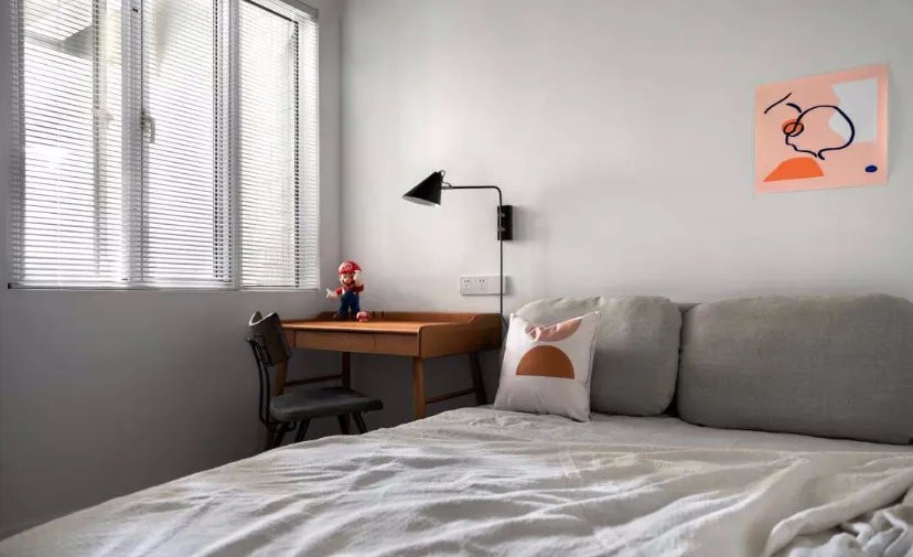 迷你用書桌代替床頭柜配上壁燈看書寫作業(yè)都很方便非常實(shí)用窗簾采用百葉簾對(duì)小空間來說更為輕盈。
