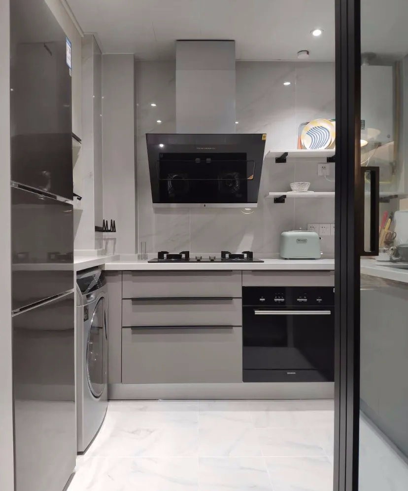 廚房墻體一體的瓷磚明亮大氣好打理U形臺(tái)面緊湊好用配上擱板收納神器廚房被收拾的井井有條。