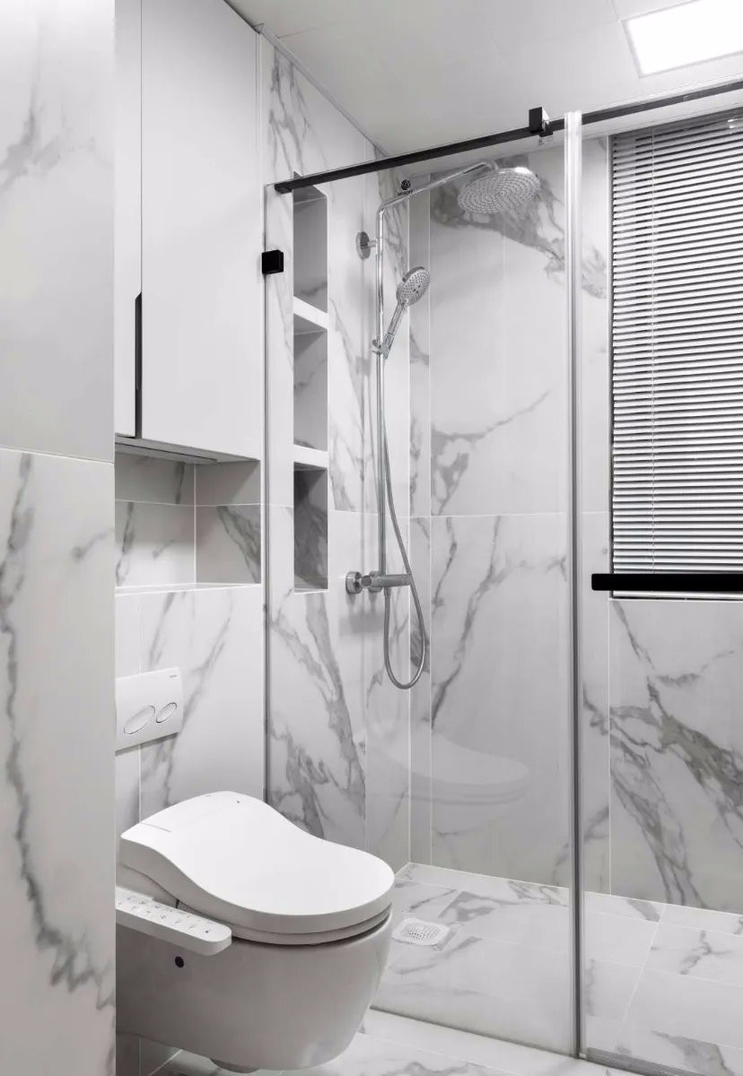 干區(qū)墻體為弧形特意定制了弧形洗手臺(tái)洗手間墻面和地面用同色系大理石瓷磚墻面更使用大尺寸墻磚整體性更強(qiáng)更開放大氣????。