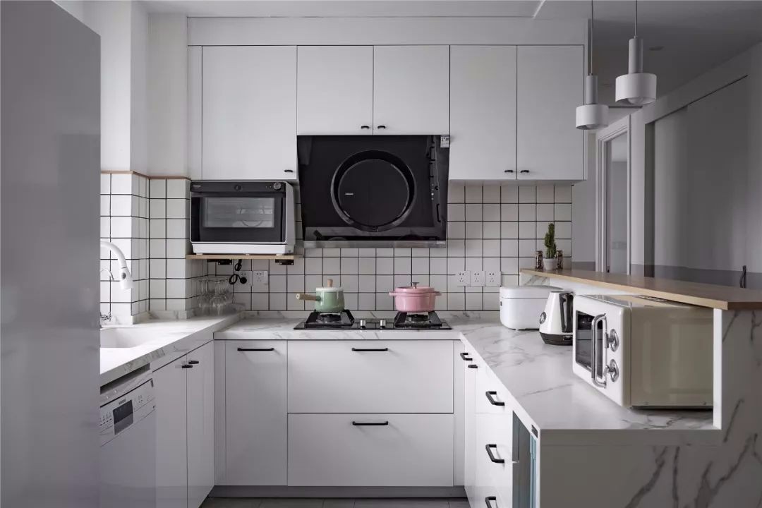 廚房白色的格紋小磚,搭配簡約白色的櫥柜,獨特的定制操作臺上做了一個小高臺,小電器放在下方,上方臺面還能作為置物臺用,讓小空間也更加實用自然。