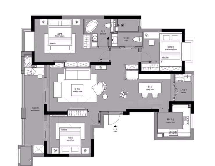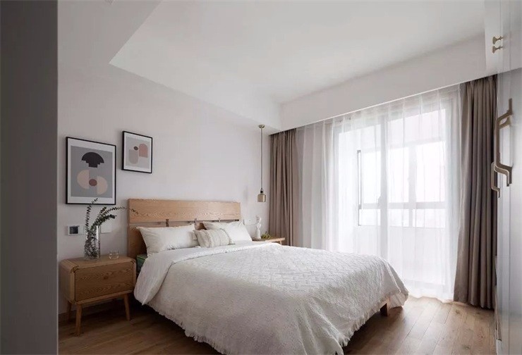 臥室墻面刷上經典***的灰色調,床和床頭柜選擇現(xiàn)代風格胡桃木。