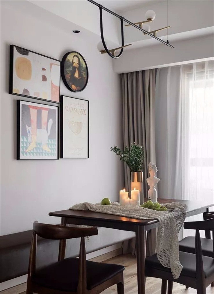 餐廳餐桌椅選擇更深沉有質感的胡桃木,靠墻放置一張皮面長凳,增加逼格的同時,可以容納更多人入坐。