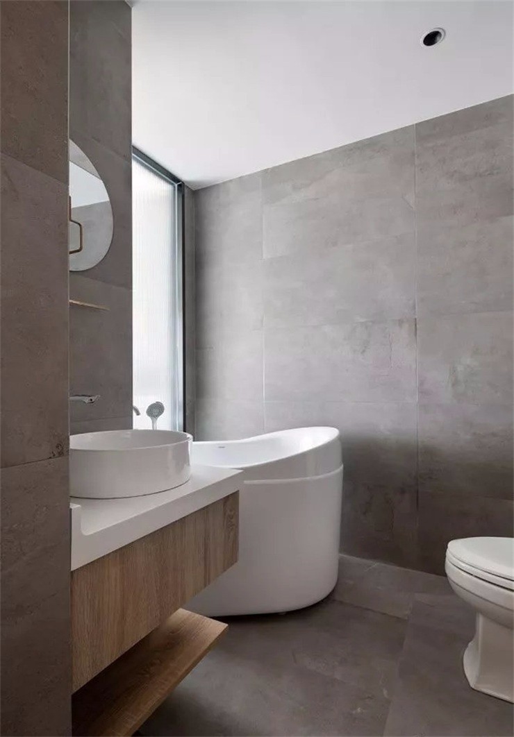 衛(wèi)生間走的是現(xiàn)代極簡風格,灰色調墻地面和白色浴缸+臺上盆組合,視覺沖擊感非常強。