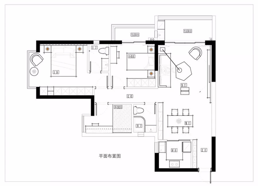 客廳區(qū)域的沙發(fā)和不規(guī)則臺面茶幾,以及大理石面電視背景墻。每個設(shè)計,每個線條,都簡單利落,個性十足。