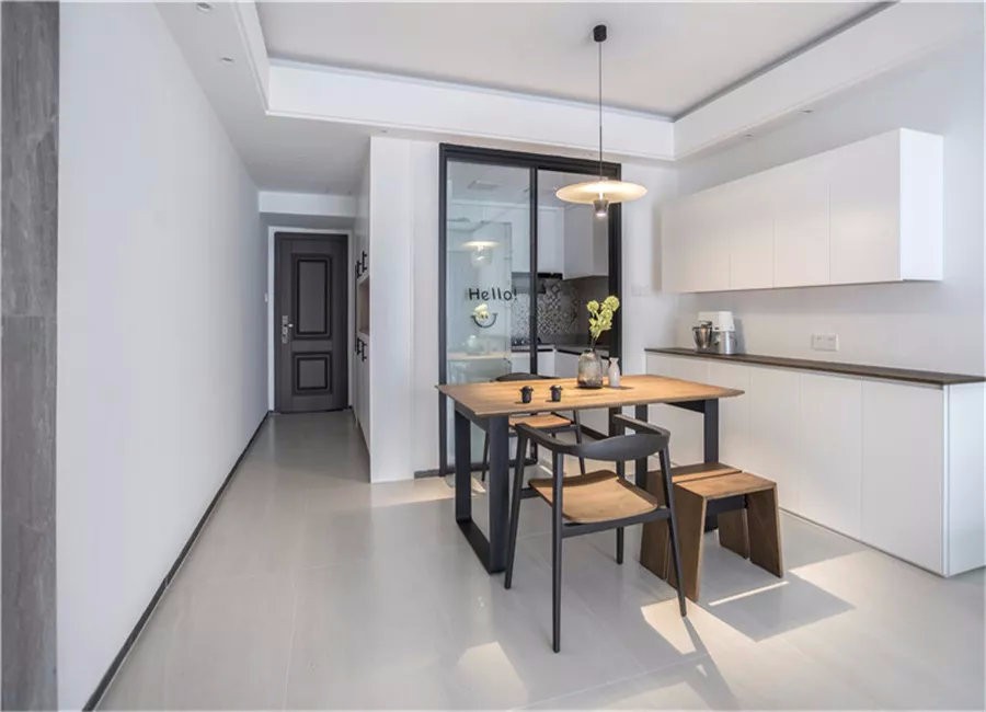 餐桌椅在玻璃廚房門外面,旁邊過道是比較狹小的入戶玄關(guān)。