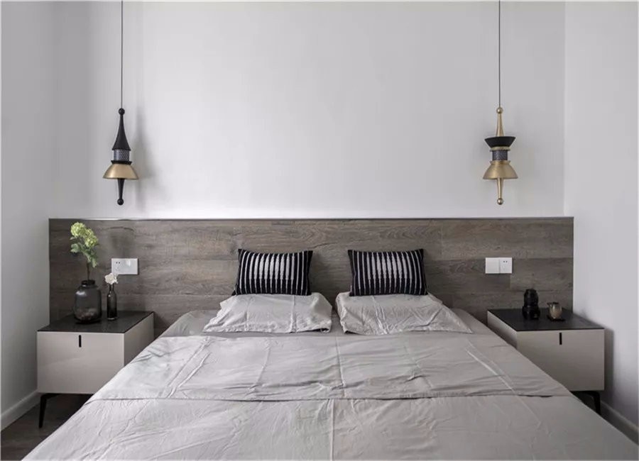 床頭做了帶灰調(diào)的木質(zhì)半墻,簡約大氣。對面是正面墻的白色定制衣柜,顏值實用性并存。