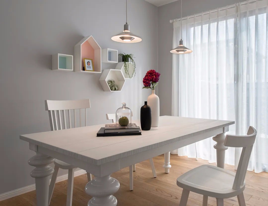 簡凈餐廳中間擺放著一張獨具特色的餐桌。