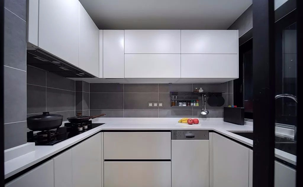 廚房以灰白為基調(diào),一眼望去:干凈、清爽、簡約,顏值高又方便實(shí)用的廚房才配得上好的廚藝。
