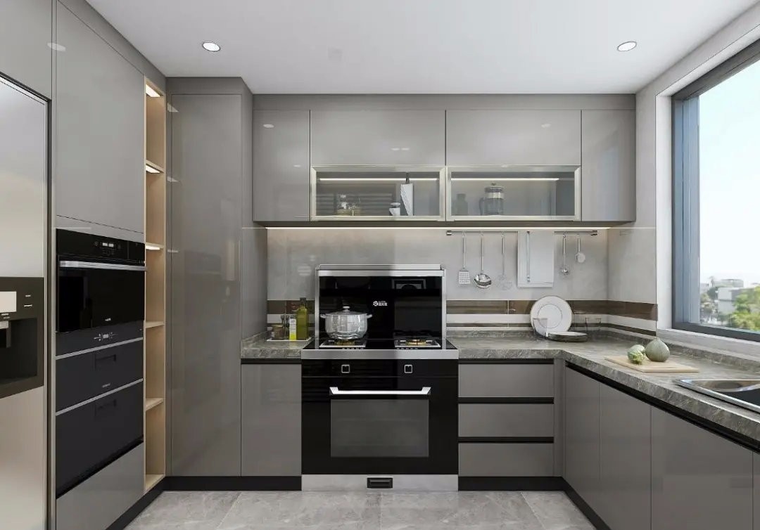 廚房采用了現(xiàn)代深色烤漆做整體,簡約卻又顯得不簡單。