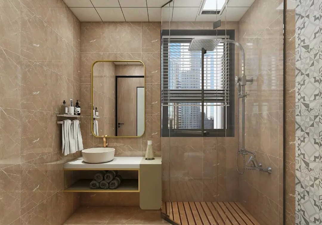 通過花磚把空間區(qū)分開來,玻璃隔斷把淋浴室和外部做到了干濕分離。