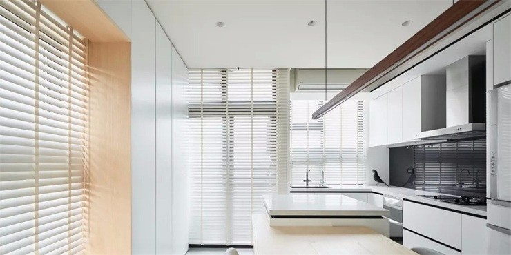 L型的廚房布局,中間還有一個(gè)小的島臺,與餐桌相連。雖然空間不是很大,但各種機(jī)能都齊全,日常烹飪綽綽有余。