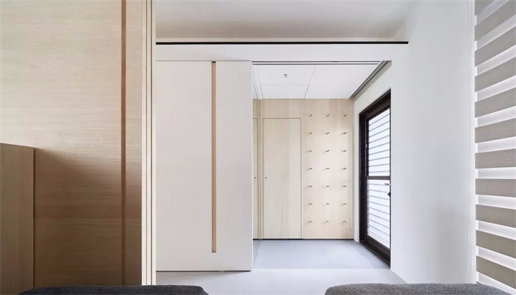 衛(wèi)生間與臥室相對,木門與墻面融合成一體,旁邊還有很多掛鉤,方便懸掛各種物品。????