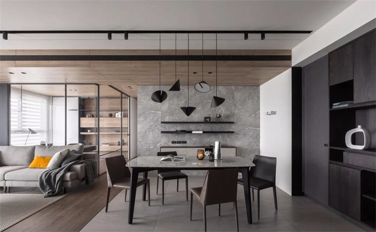 餐廳在灰色大理石背景墻的基礎(chǔ)裝上黑色的擱板,布置大理石材質(zhì)臺(tái)面的餐桌,讓用餐氛圍顯得華麗而又優(yōu)雅端莊。