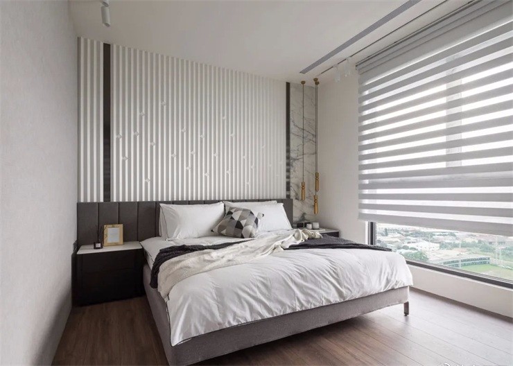 灰色布藝床與床頭靠背設(shè)計(jì),結(jié)合百葉簾的窗簾,讓空間顯得優(yōu)雅明亮而現(xiàn)代自然。