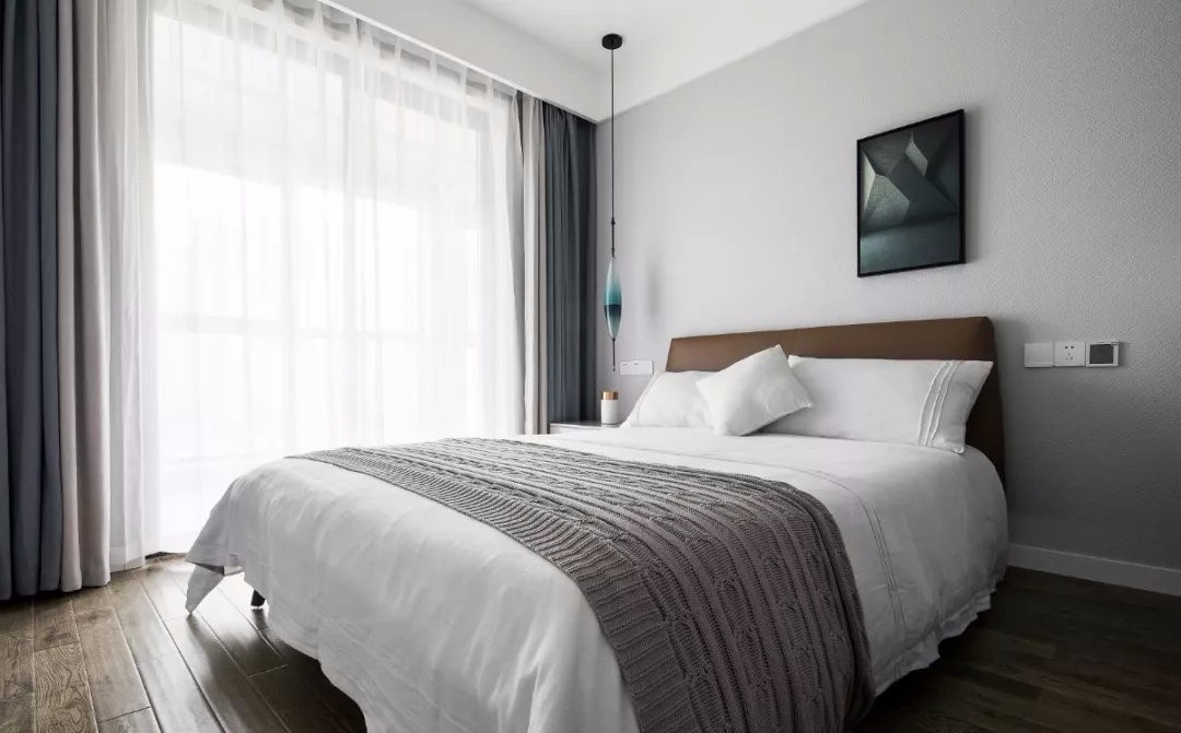 臥室以灰色的墻面,布置上一張淺棕色的皮藝床,整體氛圍也是更加現(xiàn)代舒適。