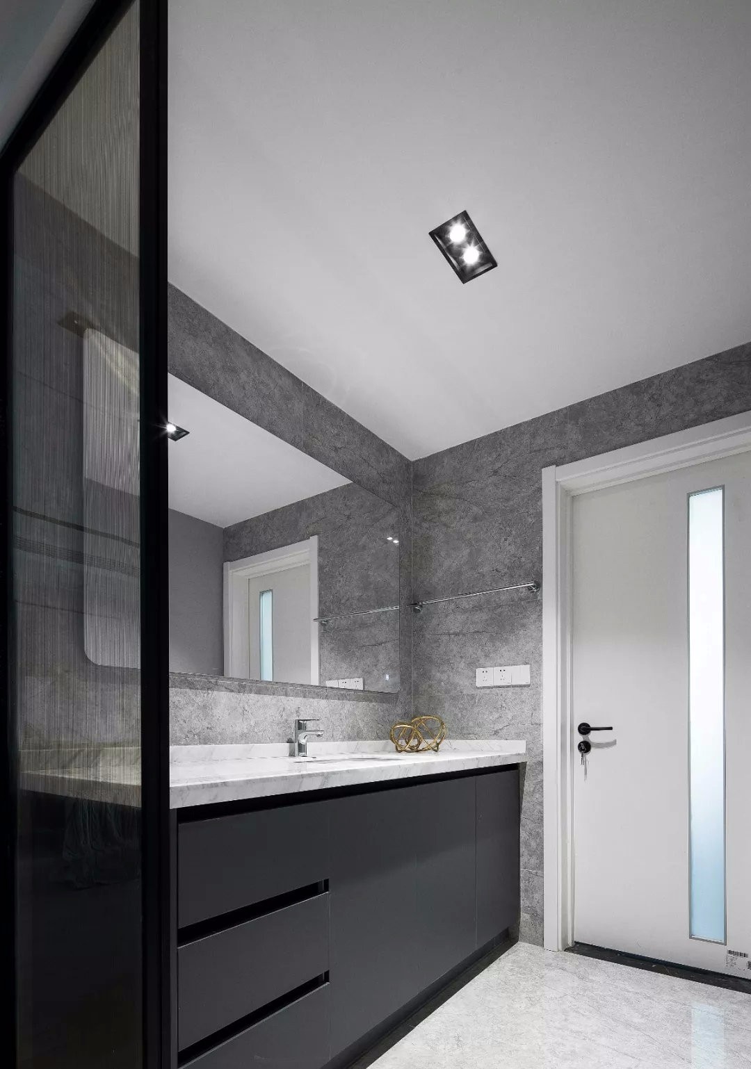 衛(wèi)生間的洗手盆設(shè)置在過道區(qū)域,以玻璃隔斷獨(dú)立出來,保持空間的獨(dú)立性與通透感,在灰色時尚的走廊上,看起也更加的端莊大方。