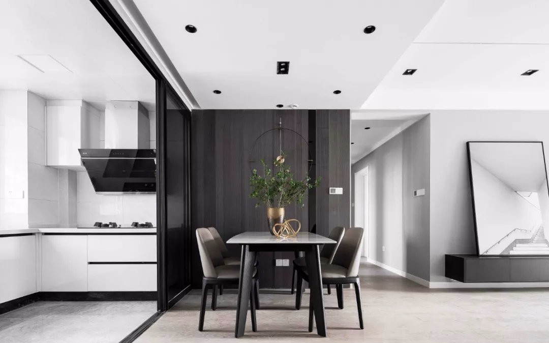 餐廳與廚房隔著推拉門,廚房也是黑白灰的時尚空間,打開推門后餐廚空間互通,顯得格外的寬敞舒適。