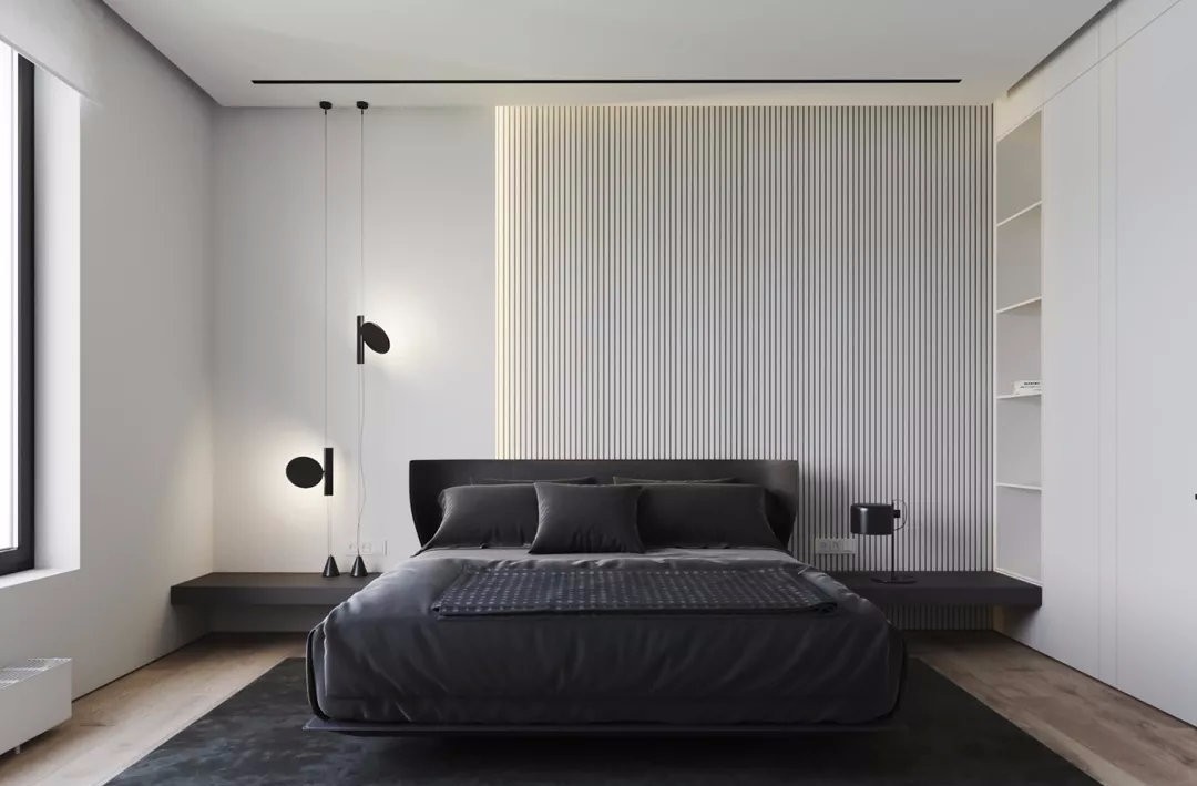 臥室的床頭墻加入了白色的豎紋造型,搭配黑色皮藝靠背的床鋪,還有深灰色的床單與地毯,床頭側(cè)邊的吊燈擺設(shè),都讓空間顯得更加現(xiàn)代優(yōu)雅。