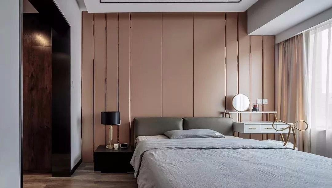 主臥背景使用皮質硬包飾面,使空間規(guī)整而干練,簡潔的線條,視覺上給人縱向的延伸感。