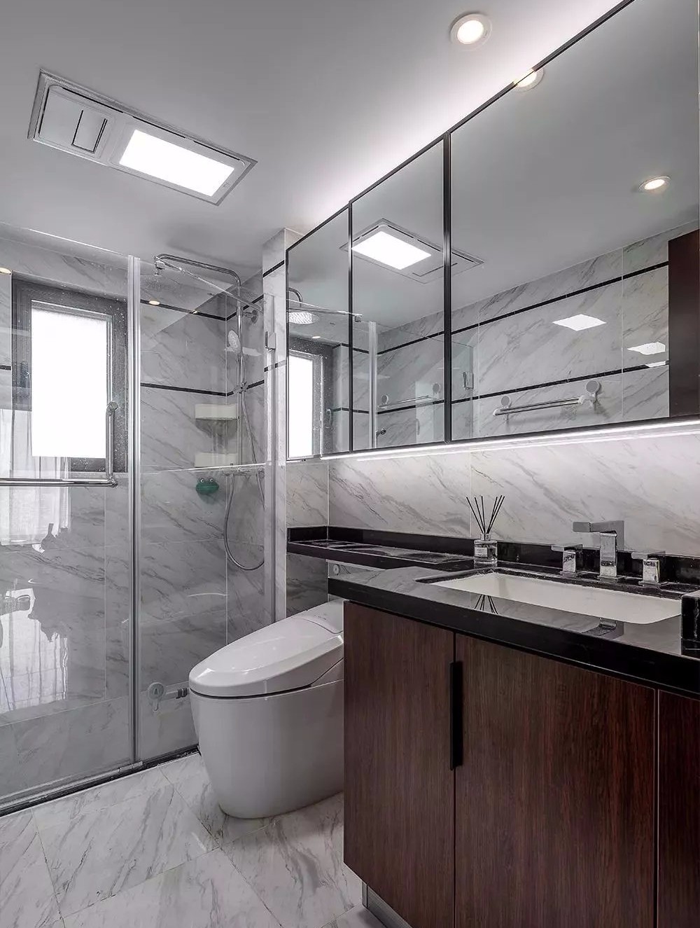 衛(wèi)生間臺面的石材延伸到了馬桶上方,可以方便放一些小物件,上方的鏡柜一直拉通做滿。????