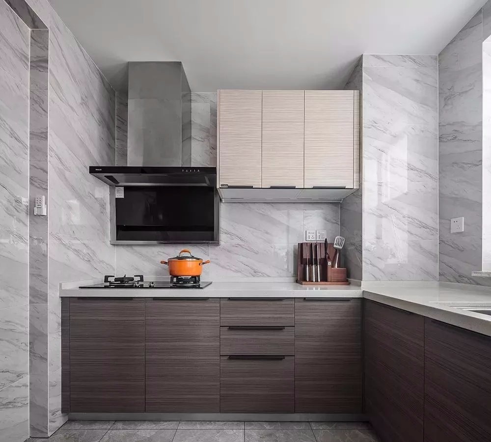 改大的厚的廚房做了U型臺面,合理的動線安排,收納量充足的柜體看上去依舊整潔明亮。