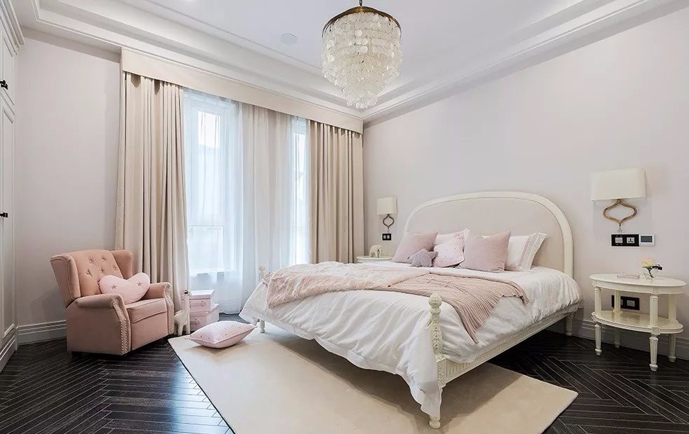 選用了清淺的藕粉色作為主色調(diào),配合黑胡桃的實木地板,在俏皮中多了一份沉穩(wěn),溫柔中多了一分篤定。