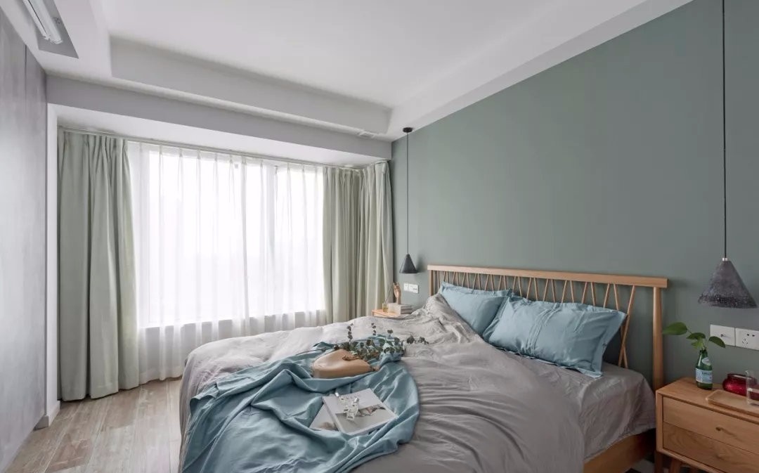 臥室床頭背景墻素綠色的墻面,結(jié)合木質(zhì)的床,現(xiàn)代舒適的床單,提供了個(gè)輕松愜意的睡眠空間。