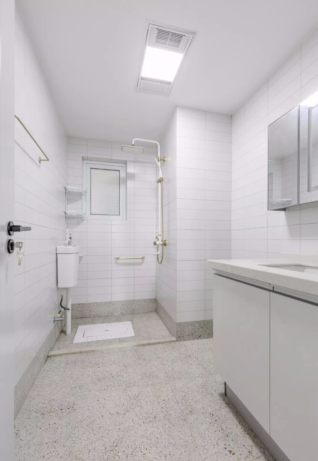 整體潔白的衛(wèi)浴潔具,洗手盆前面的浴鏡柜留出了一排的開放格架,讓洗漱用品可以方便地存放上去。