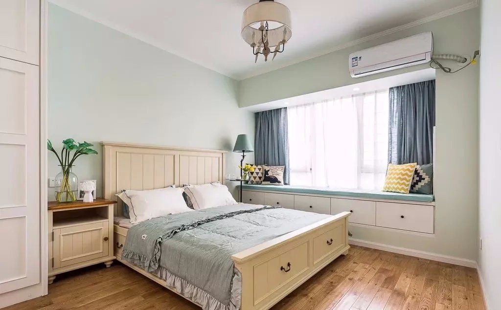 主臥的整體色點很清新淡淡的綠色帶有飄窗柜滿足了收納的需求。