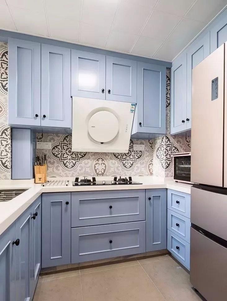 地板鋪灰色地板磚客餐廳選用淡藍色的櫥柜整體非常的獨特新穎。
