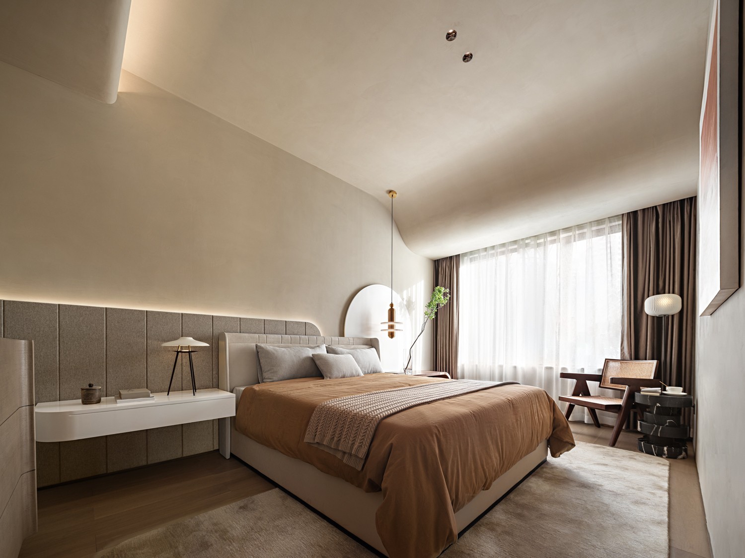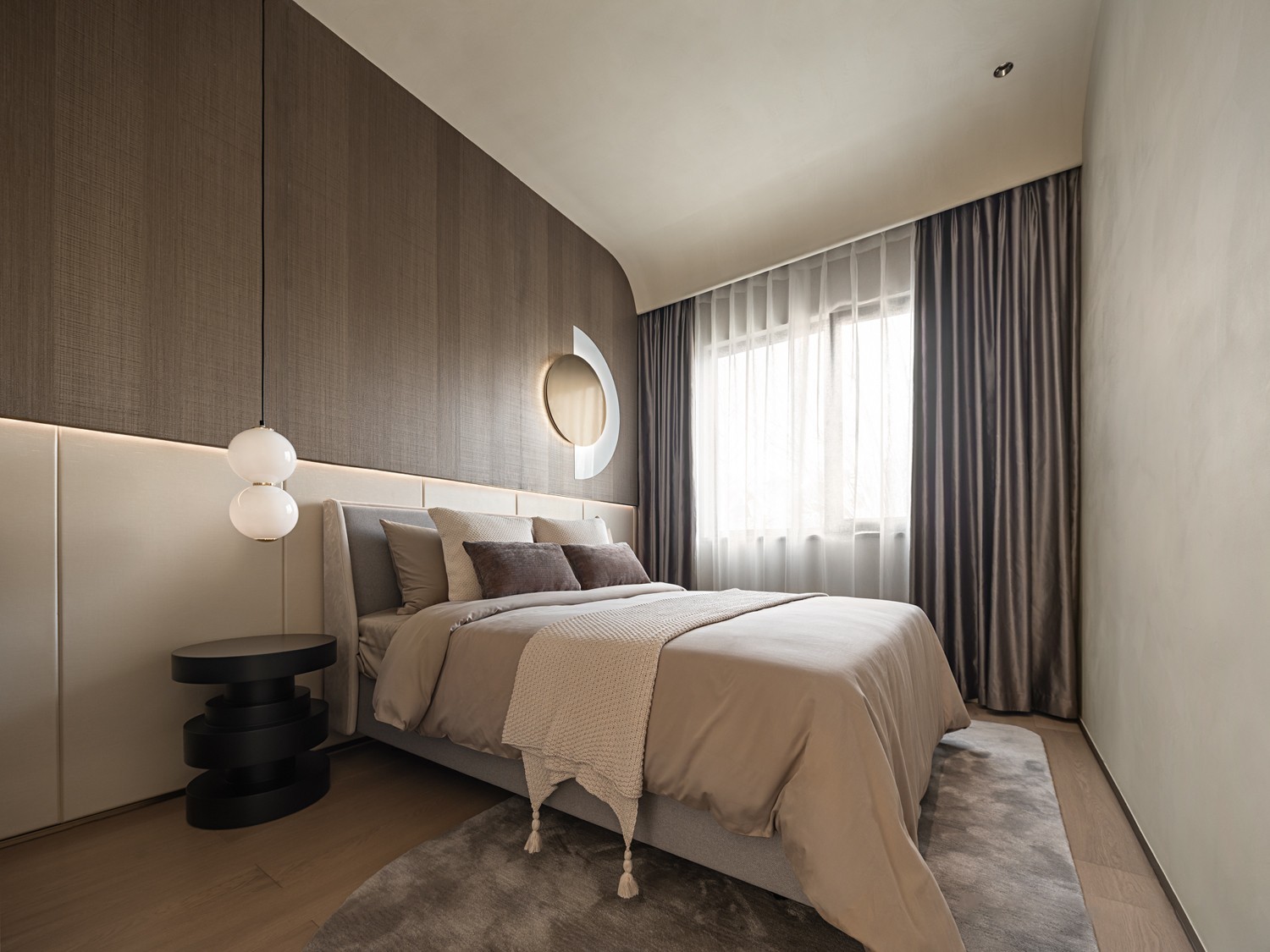 長輩房以自然元素貫穿始終,墻面用木飾面修飾,儲物柜選用了傳統(tǒng)的竹編材料,墻面金屬壁燈豐富了空間的形體和質(zhì)感。