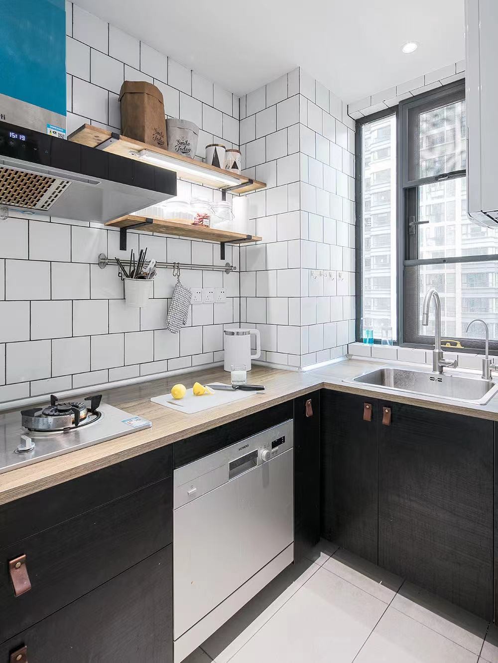 廚房墻面采用小磚,顯得有層次感