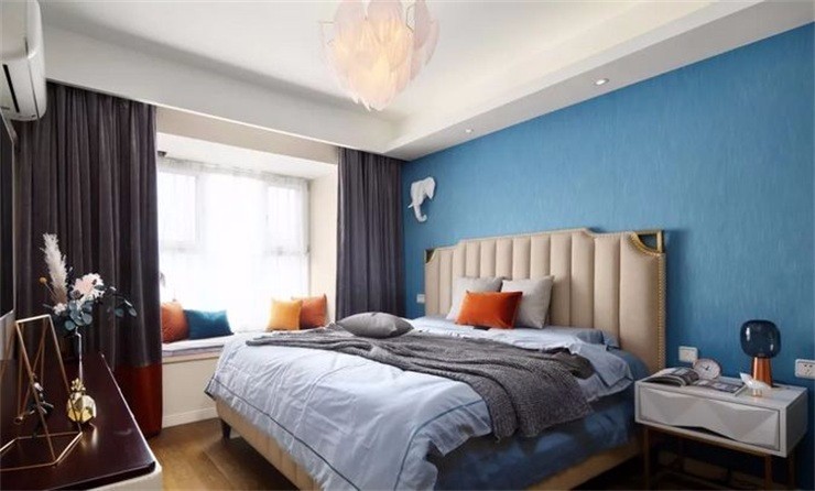 主臥大膽的嘗試了深藍(lán)色的背景墻,又用米黃色的床頭中和了色彩的飽和度,加入了一些復(fù)古金屬感的裝飾品,讓整個(gè)臥室告別以往的枯燥乏味,顯得活潑俏皮。