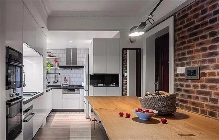 定制櫥柜環(huán)繞著整個水吧區(qū),可以用來存放各種物品,將電器設(shè)備都嵌入柜體,節(jié)省空間,整潔有序。