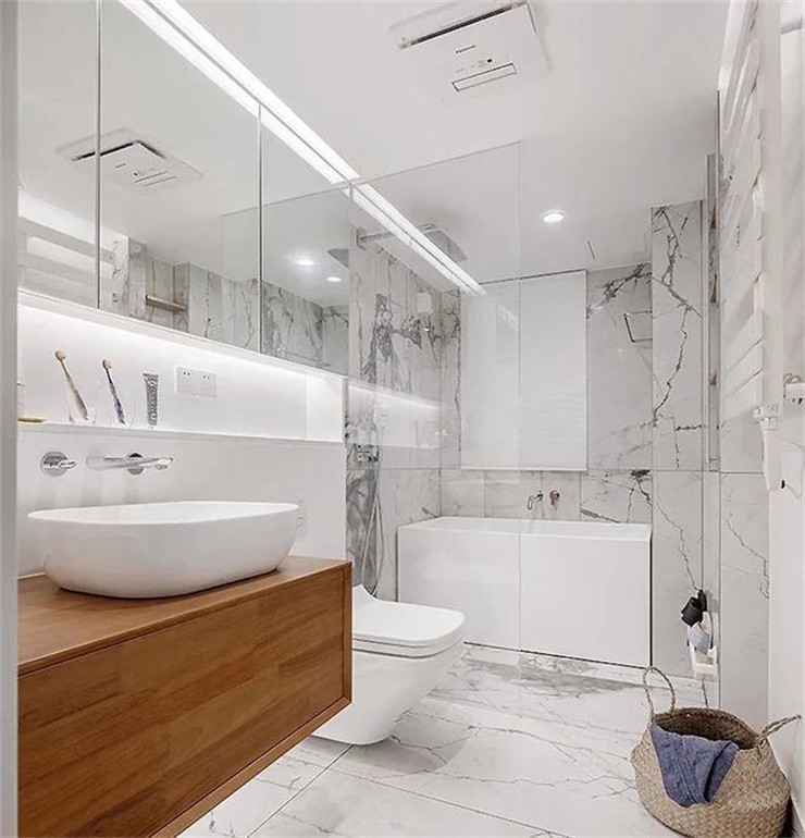 鏡柜延伸至淋浴區(qū)的玻璃隔斷處,提供強大收納功能大理石紋路背景搭配木質(zhì)浴室柜,洋溢平和優(yōu)雅的氣質(zhì)。????