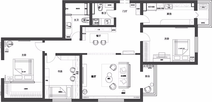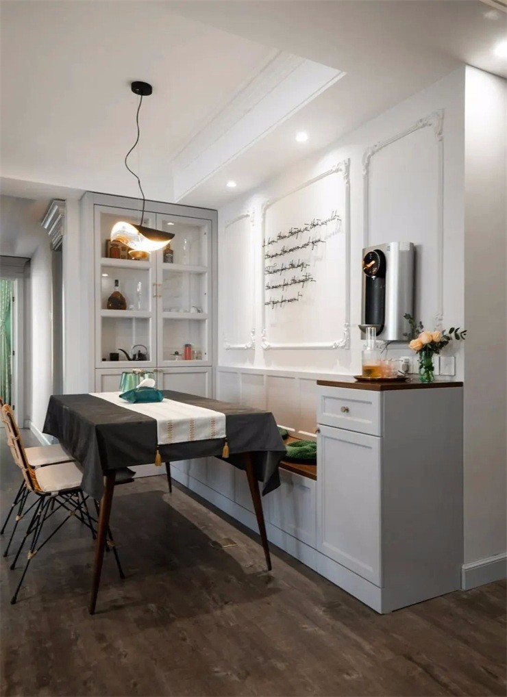 餐廳采用卡座的形式將餐邊柜酒柜與卡座功能結(jié)合在一起極大的利用了并不富裕的餐廳空間。
