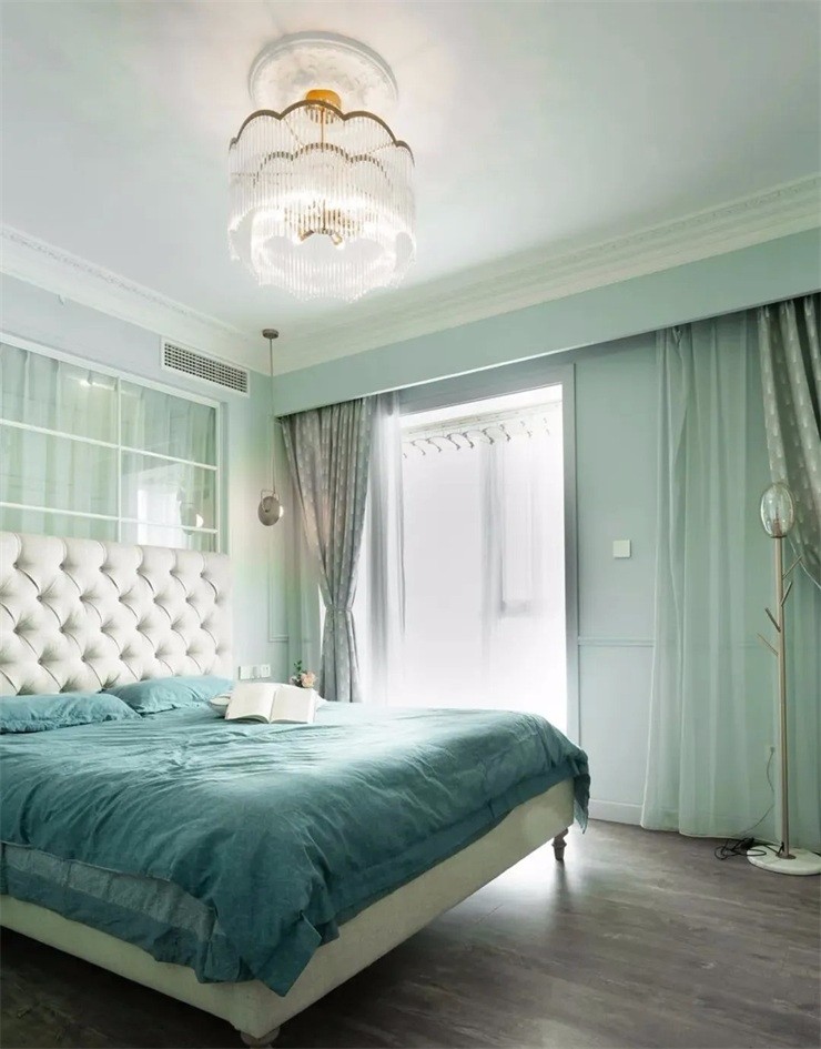 主臥相比客廳空間臥室的主色調(diào)為更加清透的薄荷綠色優(yōu)雅從容一盞造型典雅的主燈提升空間顏值。