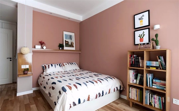 主臥進門做成了衣帽間,床頭省了,上層的隔板,及裝在墻上的木板替代了床頭柜,簡約又實用。