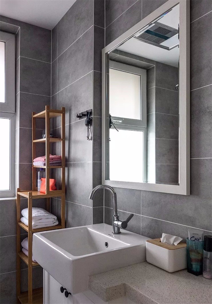 衛(wèi)生間墻面磚很新潮,收納也做得很合理,角落的空間也充分利用起來了。????