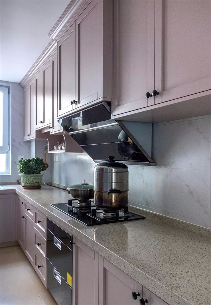 灰色調(diào)的櫥柜、大理石臺面,廚房簡約優(yōu)雅,又易于打理。
