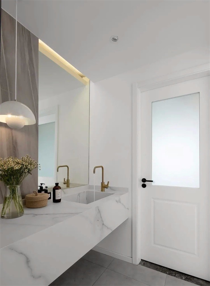 空間呈現(xiàn)出一種層次感,配合頂面防水石膏板的吊頂設(shè)計(jì),提升空間的縱深感。