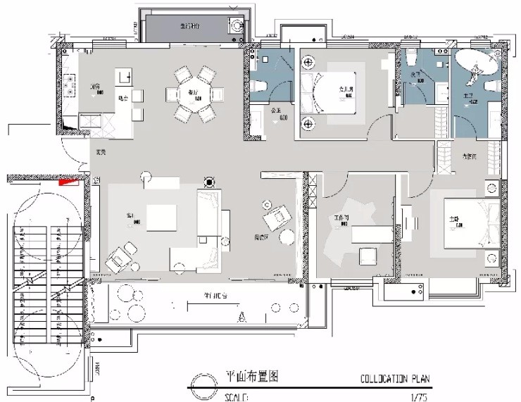 靛青色的地毯,搭配米白色的沙發(fā),再加上茶幾上猶如山巒疊嶂的藻井,在細(xì)節(jié)之處,賦予空間一抹風(fēng)雅。