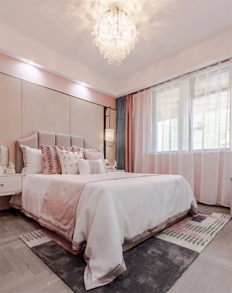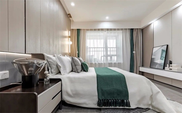在色調(diào)上,以低飽和度的色彩為主,并且搭配立體掛畫、灰色、綠色床品,讓臥室空間眼前一亮,時尚之中又不失輕奢簡約之美。