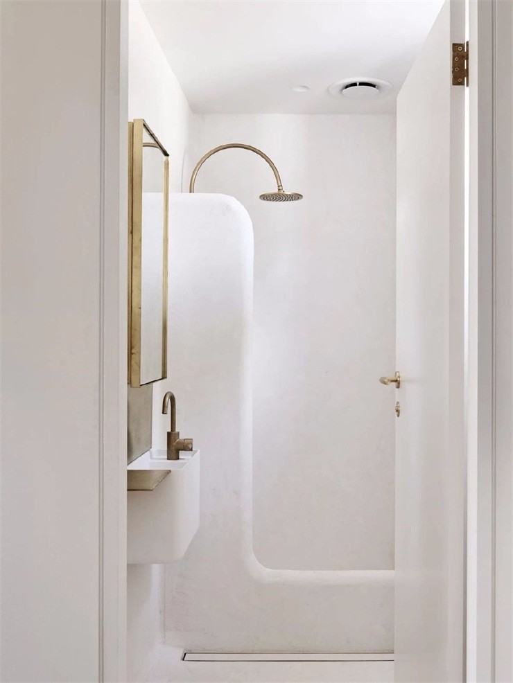 黃銅的配件以及帶有弧度的洗手臺、浴缸。