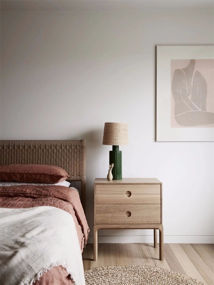 臥室同樣充滿自然的氣息,編織的床頭、地毯以及衣櫥。