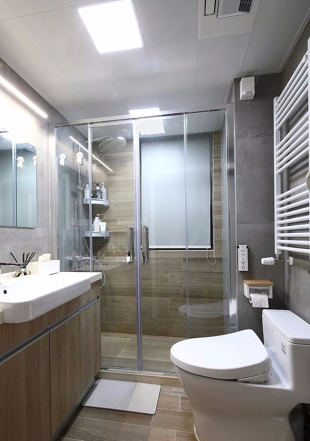 衛(wèi)生間把木紋磚貼滿了地面與墻面,結(jié)合木質(zhì)洗手盆,整體空間質(zhì)感自然溫馨,結(jié)合灰色簡約的墻磚,讓空間更加年輕時尚。