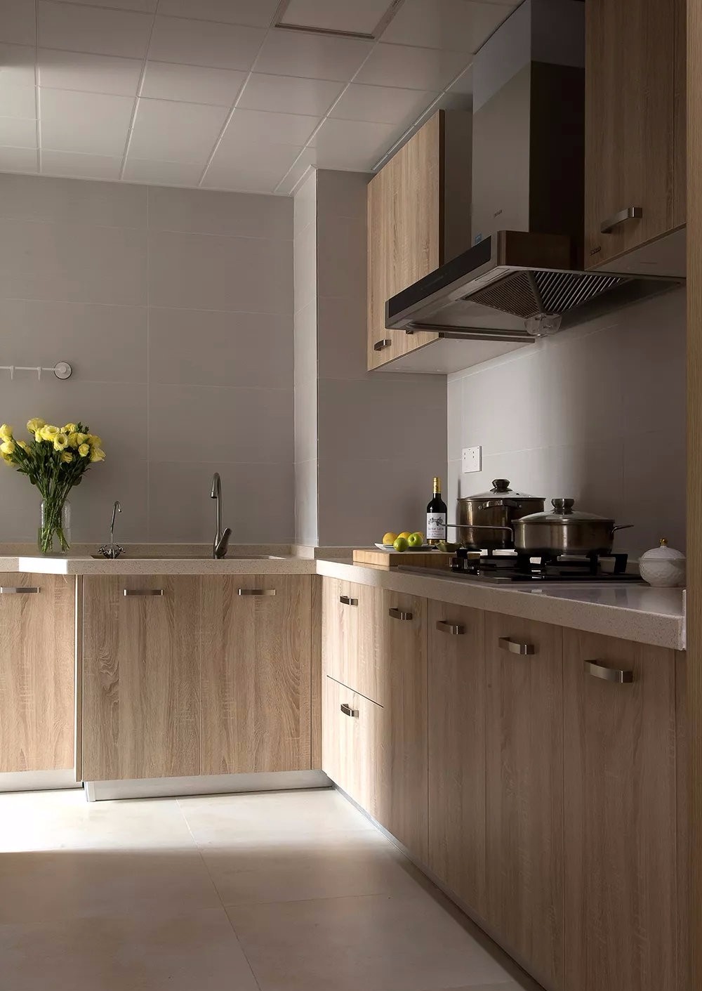 廚房暖灰色的墻面與地磚,搭配木色的櫥柜,讓做飯的空間溫馨而又簡潔自然。